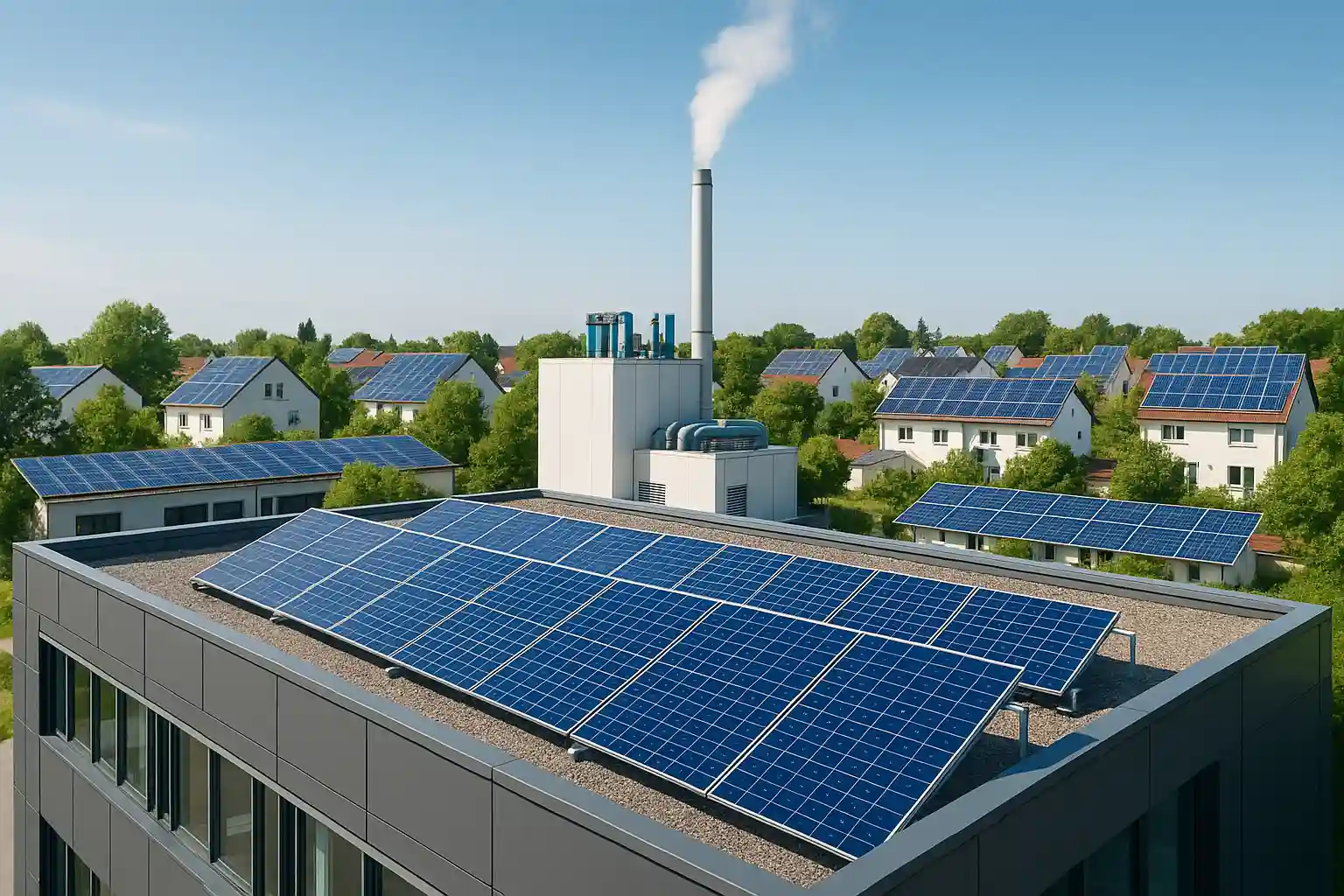 Zwei Technologien stehen im Zentrum der dezentralen Bewegung: Photovoltaik-Anlagen (PV) und Blockheizkraftwerke (BHKW). PV-Anlagen wandeln Sonnenlicht direkt in elektrischen Strom um und sind zu einem Symbol der Energiewende geworden. Allein in Deutschland trug die Solarenergie 2024 bereits rund 15 % zur Stromerzeugung bei. BHKWs hingegen nutzen das Prinzip der Kraft-Wärme-Kopplung (KWK), um hocheffizient gleichzeitig Strom und nutzbare Wärme zu erzeugen. Sie sind besonders für Gebäude mit konstantem Wärme- und Strombedarf ideal und sorgen für eine stabile Grundversorgung.